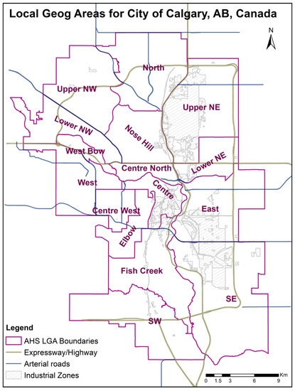 Asthma prevalence and emergency room visit data were retrieved from the Alberta Health Interactive Tool [41]. Two asthma-related variables were available: Age-Standardized Asthma Prevalence (ASAP), along with Age-Standardized Asthma Prevalence Rate (ASAPR), and Age-Standardized Emergency Visits (AEV), along with Age-Standardized Emergency Visit Rate (AEVR). None of these variables were available for specific age groups; for this reason, this study cannot specifically analyze children. Of these variables, AEV was chosen as a proxy for asthma exacerbation [9]. The variables of interest were extracted for each of the 16 Local Geographic Areas (LGA) within the Calgary zone, over the entire study period (2008–2018). LGAs are the smallest geographical area defined by the Government of Alberta primarily for health service planning and management (Figure 1). Additional indicators of population and socioeconomic status (SES) were also drawn from the Alberta Health Interactive Tool [41].