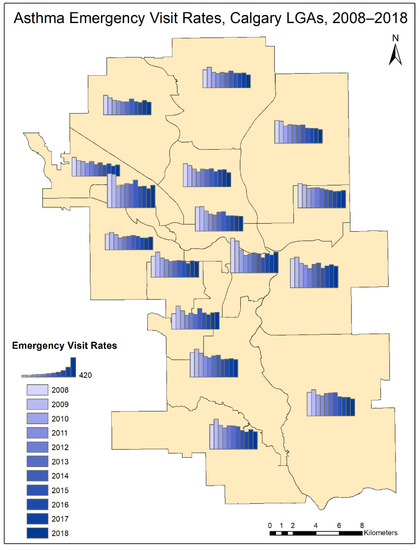 Overall, there was a decrease in AEVR between 2008 and 2018 in all LGAs in Calgary. Other studies have found that increasing concentrations of pollutants increase asthma exacerbation and emergency room visits as well as decreasing lung function [16,17,18,36]. Air pollution also decreased between 2008 and 2018; however, as seen in Figure 2, asthma exacerbation decreased drastically between 2008 and 2014 [63]. Despite the overall decreasing emergency visit rate, AEVS increased in some LGAs. The reasons for this sharp decline are unclear. However, a more expansive drug coverage was implemented in Alberta after the enactment of the National Common Drug Review process [64]. Fluticasone and Ciclesonide, inhaled corticosteroids, were added to the Alberta drug benefit program in 2007 and 2006, respectively [64]. A combination drug, salmeterol/fluticasone, has been a part of the Alberta drug benefit program since 1999 and has been considered to be both more cost effective and more effective at treating asthma [64]. It remains unclear whether the addition of the two inhaled corticosteroids could cause such a substantial decrease in AEV rates.