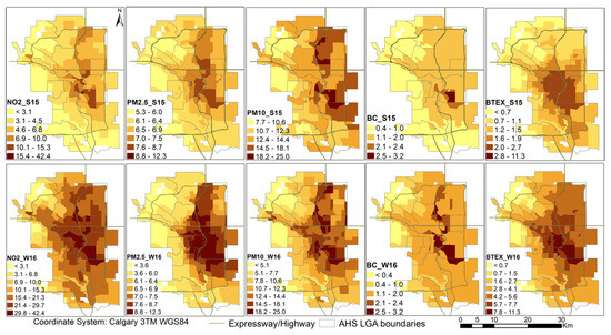 Ambient air pollutants, including NO2, PM2.5, PM10, BC, and BTEX, have been shown to exacerbate asthma [6,7,8,9,16,19,20,22,23,25,51,52]. Although Calgary has relatively good air quality [39], this study shows that significant correlations exist between ambient pollutants and AEVRs, though there is seasonal variation. The correlations to AEVs acts as proxy data and suggest asthma exacerbation [9]. This study also shows that AEVs, as well as air pollutants, exhibit a distinct spatial pattern over the vast metropolitan area of Calgary. The spatial pattern of asthma emergency visits is compatible with that of the pollutants analyzed, as correlations also suggest. Pollutant concentration is generally higher in the east, northeast, and central areas of the city—that is, areas characterized by industrial land use and major traffic corridors. Pollutants such as BC and BTEX are often a result of biomass combustion and fossil fuel combustion, whereas NO2 and PM2.5 are mainly indicators of traffic pollution and PM10 often refers to dust, mold spores, and pollen [26,27,28,29].