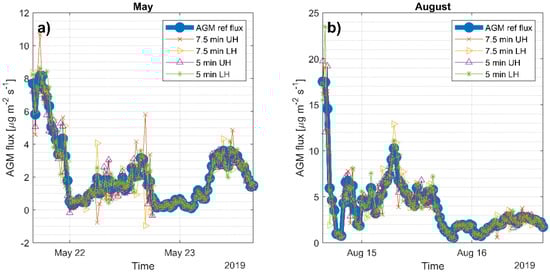 Time series of the reference and simulated AGM fluxes for 48 h in (a) May and (b) August. The thicker blue line is the reference standard AGM flux.