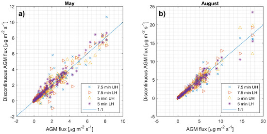 Scatter plot of simulated fluxes as a function of the AGM flux in (a) May and (b) August. The blue line represents 1:1 vertical line. Regression variables are shown in Table 4.