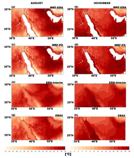 August (left) and November (right) daily mean temperatures at 2 m [°C] as simulated in WRF-ERA (a,b), WRF-PD (c,d) and from climate reanalysis ERA-Interim (e,f) and ERA5 (g,h).