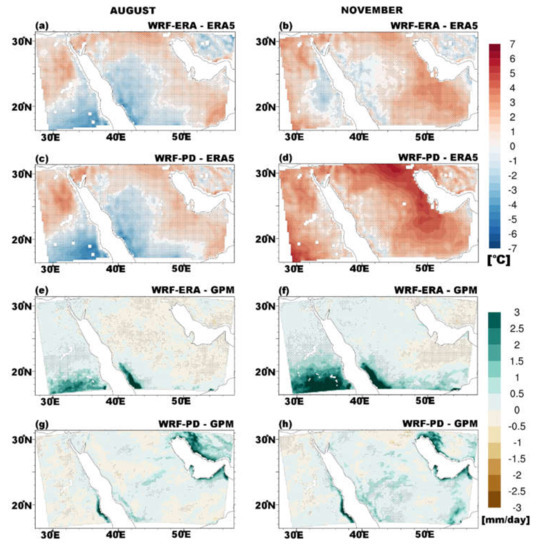 To evaluate our downscaling methodology, we focus on historical temperatures at 2 m and precipitation rates and compare our simulated climate fields from our WRF-ERA and WRF-PD simulations with the driving reanalysis product of WRF-ERA simulations and ERA5 for temperatures and with precipitation estimates from GPM and CRU for precipitation rates. WRF-ERA simulations show similar spatial structure and magnitude for mean temperatures at 2 m as ERA-Interim and ERA5 for both August and November (Figure 2). As expected, with the higher spatial resolution and shorter timesteps, effects of local spatial influences such as topography on temperatures are more pronounced in WRF-ERA compared to the driver reanalysis product. It is also evident that spatial distribution of temperatures in our WRF-ERA simulations shows closer resemblance to higher-resolution climate reanalysis ERA-5. Given the high spatial resolution (4 km) of the inner-most domain of the WRF-PD and WRF-ERA simulations, no gridded datasets at this granularity exist that can provide a commensurate landscape of the “observed” historical conditions; therefore, we cannot perform an unequivocal, quantitative assessment. However, the information provided by the more recent and high-resolution climate reanalysis product, ERA5, within our WRF model domain over the KSA region serves as a proxy for observed temperature variations. Hence, to further evaluate our downscaling setup, we calculated biases in temperatures between ERA5 and our downscaling simulations (WRF-PD and WRF-ERA) (Figure 3a–d). Statistically significant differences, tested using Student’s t-test at 5% level, are indicated via stippling in Figure 3. While the spatial distribution of temperatures in both WRF-PD and WRF-ERA are simulated well compared to ERA5 for both months, there are statistically significant negative biases over the western side of KSA and positive biases over the eastern and northern parts of KSA in August. The cooler temperatures in WRF-ERA simulations along the Asir Mountains and the surrounding higher topography of the western part of KSA are clearly evident in August. Hence, these biases are likely due to the more detailed representation of the spatial features, and therefore, temperatures in WRF-ERA could indeed be an improvement over the ERA5 product. However, due to a lack of homogeneous, high-resolution gridded observational products in the region, we are unable to assess this further. In November, the negative biases are smaller in magnitude and extent along the western KSA in WRF-ERA simulations compared to August and even exhibit a narrow band of positive bias along the western coastline. Biases between WRF-ERA and ERA5 are more enhanced over the Empty Quarter in November. Furthermore, while the biases in WRF-ERA and WRF-PD simulations have similar signs and spatial structure over KSA, WRF-PD simulations have stronger positive biases compared to ERA5 in November. Nevertheless, both our CESM-driven WRF simulations (WRF-PD) and ERA-Interim-driven simulations (WRF-ERA) are able to capture the main features of the spatial distribution and magnitudes of mean historical temperatures at 2 m with stronger biases in November in WRF-PD.