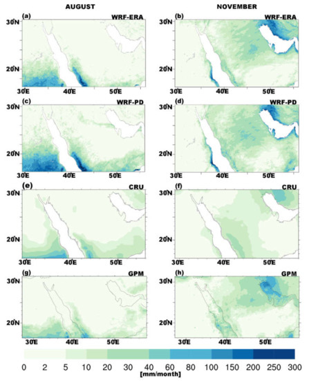 As previously noted, August and November monthly precipitation rates from the WRF-ERA and WRF-PD simulations are assessed against interpolated measurements from CRU as well as GPM retrievals (Figure 4). Overall, the most significant spatial features of monthly precipitation rates over land in WRF-ERA and WRF-PD simulations are also seen in the CRU and GPM products (Figure 4). In particular, the precipitation maxima in November across central KSA, which extends coast-to-coast from the Red Sea to the Arabian Gulf, is prominent in both WRF simulations and GPM retrievals. In addition, the elevated precipitation rates in the southernmost regions of the AP are also clearly distinguishable in August. During both months, the enhanced precipitation rates as a result of the orographic effects of the Asir mountains are also prevalent. Furthermore, the persistent absence of precipitation or the lowest precipitation rates across the Empty Quarter (i.e., Rub’ al Khali) are evident in both the WRF simulations and gridded observations/retrieval-based estimates. To further assess our downscaling, we calculated biases in daily precipitation rates between GPM and our downscaling simulations (WRF-PD and WRF-ERA) (Figure 3e–h). Both WRF-ERA and WRF-PD yield statistically significantly enhanced precipitation rates over the Asir mountains in August, and this enhancement is more pronounced in the latter. WRF-PD is drier over the Empty Quarter in August. During the wet season, represented here as November, both WRF-ERA and WRF-PD produce similar positive biases with enhancements over higher topography along the western part of KSA. Quantitative differences in precipitation rates between our high-resolution WRF simulations (at 4 km) and observed/retrieved/reanalyzed products are expected due differences in horizontal resolution and uncertainties in observational products (see Section 2). Furthermore, the driver of our WRF-PD simulations is a CESM simulation that is not assimilated with observations after 1950, while the CESM fields that are input to our WRF simulations have been bias-corrected at NCAR [24,25]. As a result, some differences between WRF-PD and historical observational products are expected.