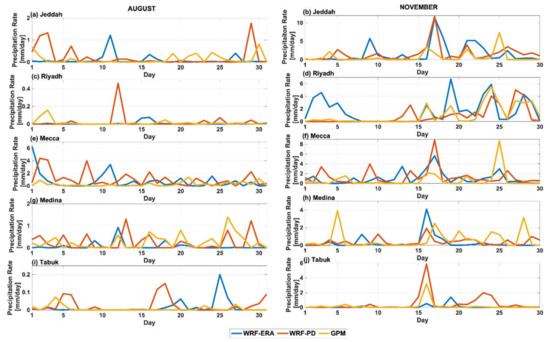 Day-to-day variation in precipitation rates (mm/day) in August (left) and November at five local sites, Jeddah (a,b), Riyadh (c,d), Makkah (e,f), Madinah (g,h), Tabuk (i,j), as simulated from WRF-ERA and WRF-PD and in retrievals from GPM averaged over 2008–2017.