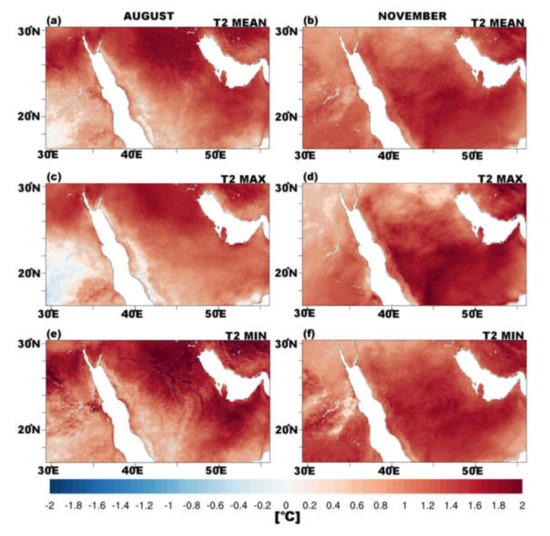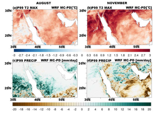Aside from the changes in mean fields, we also analyzed changes in the extreme temperatures and precipitation rates by the middle of the 21st century (Figure 8). We find that the 99th percentiles of 2-m daily maximum temperatures increase in November and August by as much as 3 °C by mid-century in our highest resolution domain (Figure 8a,b). In November, this increase is quite pronounced over the northern and northwestern parts of KSA, while in August, the increase in extreme temperatures is more uniform and slightly higher in the southern parts of KSA.