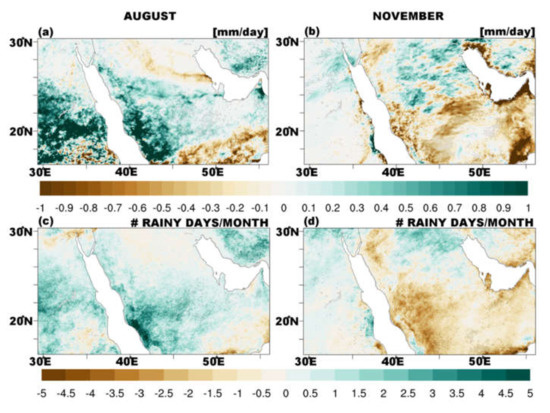 For daily precipitation, we find that extreme rates increase over the western parts of KSA in August (Figure 8c), particularly along the coast of the Red Sea and surrounding the Asir Mountains, while a reduction is simulated over approximately the same area in November (Figure 8d). There is an increase in extreme precipitation rates by mid-century over some areas in the central and northeastern parts of KSA in November, while extreme precipitation rates over the same areas remain unchanged in August. Furthermore, across the northern flank of the Empty Quarter, there is a large region that experiences a reduction in extreme precipitation rates in November and along with the corresponding decreases in mean precipitation (Figure 7), this indicates a potential northward expansion of this extremely dry environment (toward Riyadh).