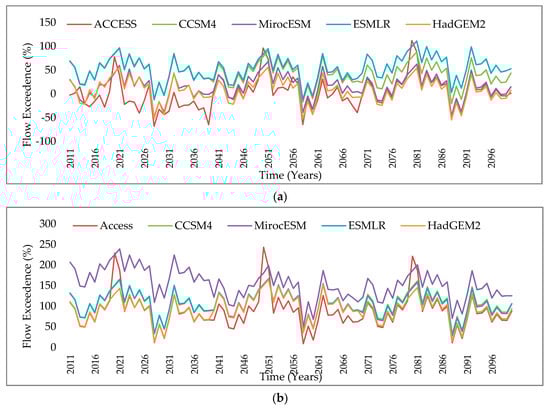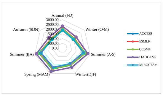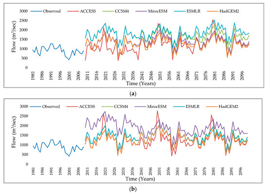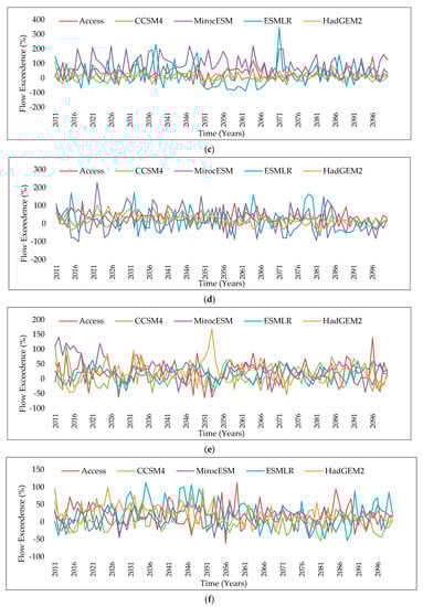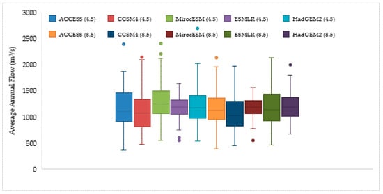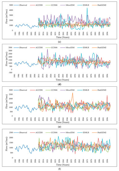 - The projected average annual flow will increase constantly for all five GCMs and their ensemble, especially in the Spring season with a 193% increase, but there will be a decrease in the streamflow during the autumn season. Moreover, there will be an excess of high flows and low flow events for the projected flows.