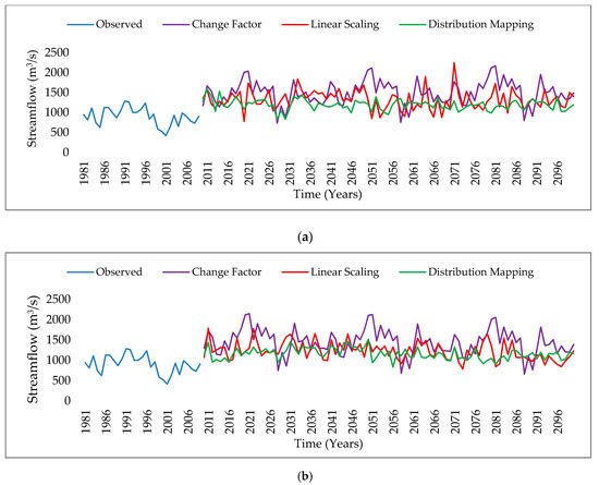 - Muerth, M.J.; Gauvin St-Denis, B.; Ricard, S.; Velázquez, J.A.; Schmid, J.; Minville, M.; Caya, D.; Chaumont, D.; Ludwig, R.; Turcotte, R. On the need for bias correction in regional climate scenarios to assess climate change impacts on river runoff. Hydrol. Earth Syst. Sci. 2013, 17, 1189–1204. [Google Scholar] [CrossRef]