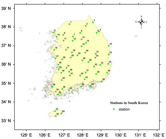 In the current study, 55 weather stations that record maximum temperature in South Korea at the daily timescale were employed. Most stations have a data period of 40 years from 1976 to 2015, except for Andong station (1983–2015) and Chuncheon station (1988–2015).