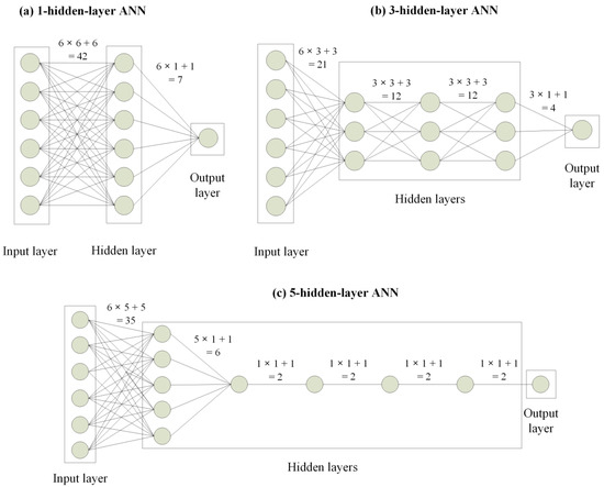 Schematic of the artificial neural network (ANN) with the total parameter number of 49 corresponding to (a) 1 hidden layer; (b) 3 hidden layers; and (c) 5 hidden layers.