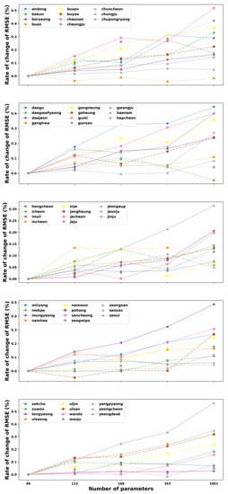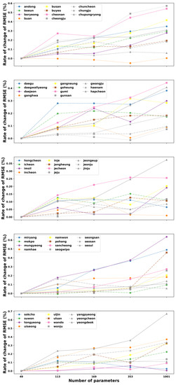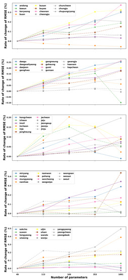 However, we can also observe that the increased parameter size of the ANN model made the error’s change decrease lightly at Buan stations. Moreover, several sites have the lowest change values of RMSE at the parameter of 1001, such as Daegwallyeong, Gunsan, Hongcheon, and Tongyeong. These sites have an increasing trend of error when the number of tunable parameters in the network is raised from 49 to 169 (Hongcheon) or 353 (Daegwallyeong, Gunsan, and Tongyeong) before declining to the lowest point at 1001. Similarly, Figure 4 illustrates the general relationship between the total numbers of parameters versus the rate of change of RMSE on testing data in all 55 stations for three hidden layers. It can be noted from this figure that in the majority of stations, the rise of parameter numbers makes the performance of the model worse due to the increase in the change of RMSE. In contrast, few stations have the best results at the parameter of 133 (Pohang), 169 (Haenam), 353 (Buan and Yeongdeok), and 1001 (Daegwallyeong). Although the fluctuation of the RMSE’s change rate for the three-hidden layer ANN, corresponding to various parameter sizes, varies from site to site, the ANN model with a structure of 49 trainable parameters still shows the best solution for predicting the maximum temperature one day ahead for most stations in South Korea.