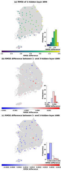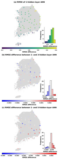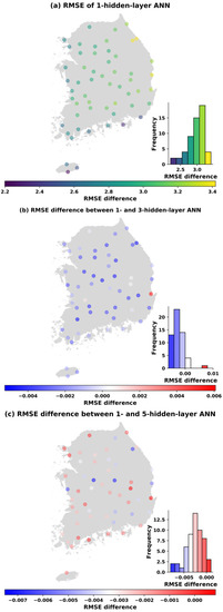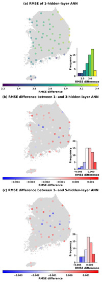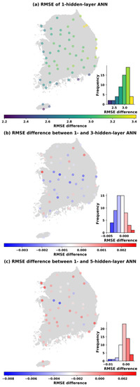 Similar spatial distributions of the changes in RMSEs also occur in Figure 7, Figure 8, Figure 9 and Figure 10 when the number of parameters is increased to 113, 169, 353, and 1001. It can be concluded that the ANN models perform better in western and southern Korea (left panels). Moreover, the visualization of the differences in the RMSE between one hidden layer and three hidden layers (middle panels) as well as between one hidden layer and five hidden layers (bottom panels) at each station is also shown in Figure 6, Figure 7, Figure 8, Figure 9 and Figure 10. It is noticed that with the same number parameters of 49, while one-hidden layer model presented better results than the three-hidden layer model at over 60% of total stations, the five-hidden layer model performed slightly greater than the one-hidden layer model at around 79% of stations where RMSE differences greater than 0 were found (see Figure 6). However, with the increase in the number of parameters, the ANN models with one hidden layer produced better results than the three- and five-hidden layer models in almost all stations.