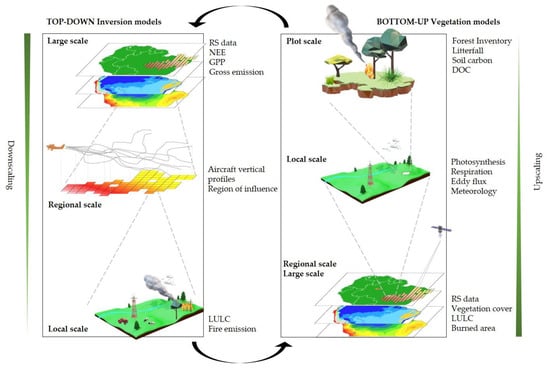 Greenhouse gas (GHG) fluxes occur at various spatial scales, from the molecular level to global cycling, meaning that analysis strongly depends on the spatial scale. The level of complexity of these GHG fluxes changes during upscaling analysis as a function of the interrelations among physical, chemical, and biological processes [,]. The method for upscaling leaf- to landscape-scale terrestrial flux processes is known as the bottom-up approach. In this approach, on-the-ground data may be combined and constrained to estimate GHG fluxes from the surface using process- or empirical-based vegetation models []. For example, in the carbon cycle, process-based models simulate the underlying biogeochemical mechanisms (e.g., respiration, photosynthesis, and fire emissions) to constrain carbon flux for each plant functional type []. On the other hand, top-down approaches include the mass balance method, transport inversion, and atmospheric models with ground, tower, aircraft, and satellite observations to estimate surface fluxes by minimizing the differences between simulated and observed atmospheric GHG mole fraction measurements [,] (Figure 1).