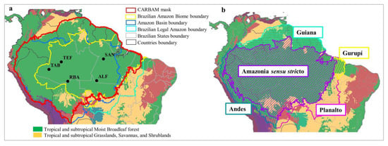 (a) CARBAM mask (Amazon study area) and flight collection sites: ALF, SAN, RBA, TAB, and TEF are represented by black circles. South American biomes are from Olson et al. []; (b) Amazon subregions used to define the CARBAM mask (with the Planalto exception) of Eva et al. [].