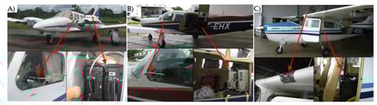 Airplanes used to collect greenhouse gases in the sites. Red arrows highlight the collector tube and the Programmable Flask Package (PFP) and Programmable Compressor Package (PCP) suitcases, respectively. (A). Model Seneca for RBA site and TAB site sampling, (B). Model Sertanejo for SAN site sampling. (C). Model Cessna 210 for ALF site sampling. Source: Domingues [], with permission.