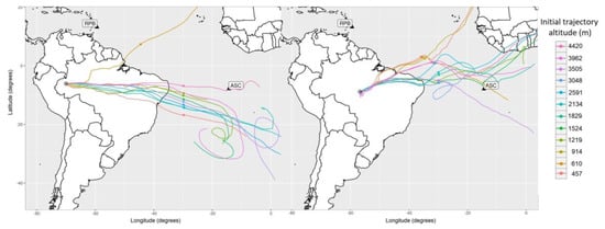 Example of the back-trajectories at each initial altitude of collection, whereby each colored line represents the collection flask by overflight altitude. Back-trajectories at the ALF site for 17 February 2010 (left) and at the TAB site for 20 April 2011 (right). The point on the trajectories represents the crossing point between two segments of a virtual limit, the first one is a latitude limit, from the equator southwards at 30° W, and the second segment is a line between NOAA stations (Barbados—RPB; Ascension—ASC; and Cape Point—CPT). This virtual limit is used to estimate GHG background concentrations for Amazon sites (see details at Domingues []).