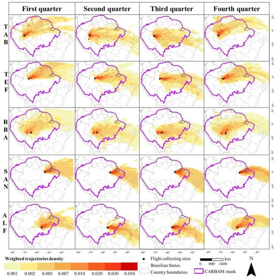 By definition, we consider the region of influence to be those areas covered by the set of back-trajectories by each profile and altitude integrated over a period. Back-trajectory models such as HYSPLIT can have high uncertainties in predicting where particles are coming from accurately [,], as we can note in Figure 4 with a spurious air trajectory at 900 m at the TAB site coming from the Northern Hemisphere. This deviation is due to several parametrizations for vertical and horizontal mixing in the atmosphere, including a convective boundary layer, circulation models, height integration models, and air temperature, humidity, and pressure []. Therefore, a reasonable method to reduce the impact of such uncertainties, as well as smaller random errors, is to consider an ensemble of back-trajectories over a period (like three months or a year). We noted several differences between the approach presented here and the estimation of regions of influence previously used by Gatti et al. []. In the case of Gatti et al. [], the region of influence was determined from the northernmost and southernmost trajectory boundaries for a given site (over a two-year period), and weighting within that region was not considered. In contrast, here, regions of influence are calculated on a quarterly basis and also contain spatial information on the relative influence of the surface with each region of influence. Finally, in the present study, calculation of back-trajectories was performed using meteorology with a resolution of 0.5° × 0.5° instead of 1° × 1°.