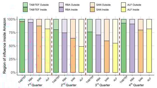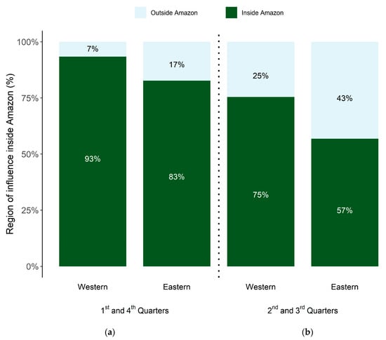 Analogous to the hydrological cycle, air masses carry gases and particles from one place to another, a process that varies by season. In the first and fourth quarters, during the rainy season, the most significant contribution of the region of influence occurs in the areas located to the north, in the region known as the Guiana Shield, in the Brazilian states of Amapá and Pará, and a small portion from the NE, from the Caatinga and Atlantic Forest biomes (Figure 6). The Amazonian region of influence (Amz_perc, Equation (2)) for the combined period of the first and fourth quarters is 83% (sd = 8.3%) and 93% (sd = 3.3%) for the eastern and western Amazon, respectively (Figure 6).