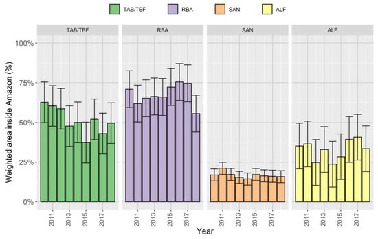 Interannual variability is less pronounced than seasonal variability due to several reasons, such as air mass circulation patterns, displacement of the ITCZ by Atlantic SSTs, the influence of ENSO, and other variations [,]. ALF also has the highest interannual variability of unweighted area, with a minimum of 1,176,114 km2 (2014: 16.2% of Amazon) and a maximum of 2,420,141 km2 (2017: 33.4% of Amazon). RBA has the lowest interannual variation throughout the years (CV = 11%) followed by SAN (CV = 16%) and TAB/TEF (CV = 18%).