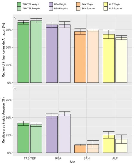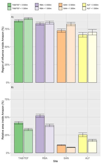 Difference between the ensemble back-trajectories up to planetary boundary layer (300–1300 m) and up to 3500 m at each study site. (A). Region of influence in the Amazon mask (Equation (2)) and (B). Relative area inside the Amazon (Equation (4)). Error bars are the standard error at a 95% significance level.