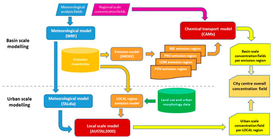 Eulerian chemical and transport models (CTMs) are commonly applied for air quality modeling at the regional scale, reasonably well estimating regional and urban background concentration levels for both primary and secondary pollutants. Conversely, they are not able to properly reproduce the local concentration gradients in urban areas due to the relatively large step of the computational grid. In order to overcome this limitation, various modeling frameworks that integrate CTMs outputs with other models have been proposed for better reproducing within-city exposure variability. Geostatistical approaches combining land use regression (LUR) and chemical transport modeling have been proposed for long-term concentrations of NO2, O3 and particulate matter [20,21,22,23,24]. Hybrid deterministic models combining a Lagrangian dispersion model (LDM) at the local scale and a CTM at the regional scale have been proposed for NOX and PM10 [25,26,27]. Indeed, LDMs can be profitably used for the assessment of local sources’ impact at high spatial resolution over a small domain because of the fine computational grid that allows a more realistic spatialization of urban emissions, depending on the road network layout and the built environment structure, also accounting for wind field modifications induced by buildings [28]. As drawbacks, LDMs do not include comprehensive gas and aerosol chemistry modules for secondary pollutants assessment and cannot be used for regional scale modeling due to their computational burden.