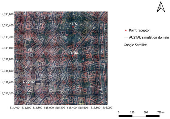 AUSTAL2000 computational domain over Milan city center and selected receptors location.