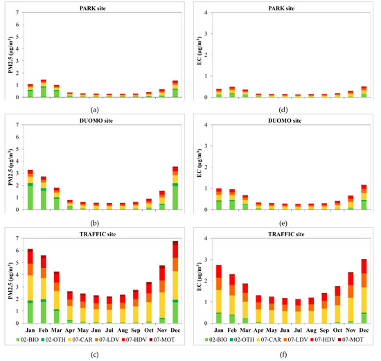 At the TRAFFIC receptor, monthly EC levels are 4 to 10 times higher than at the PARK receptor and 2.4 to 4.6 times higher at DUOMO (Figure 3f), thus pointing out spatial gradients even larger than for PM2.5, as a consequence of the greater exposure to primary emissions from traffic. Estimated EC values are in the 1.2–3 µg/m3 range, averaging about 2.3 µg/m3 and 1.3 µg/m3 in wintertime and summertime, respectively, and leading to an annual average of 1.8 µg/m3. Road traffic is by far the main contributor to EC levels (cold season: 83.8%; warm season: 98.7%; annual basis 91.2%) with single SNAP 07 sub-categories contributions prevailing on biomass burning (02-BIO) even in the cold season (Table 2).