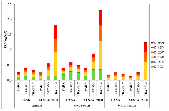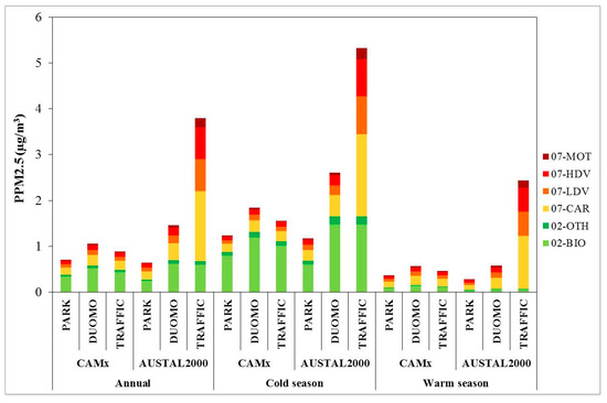 Local sources’ contributions and source apportionment results at the three urban receptors from CAMx and AUSTAL2000 runs are compared in Figure 5 for primary PM2.5 and in Figure 6 for EC. Comparisons, presented for both annual and seasonal average concentrations, point out the relatively “flat” output of CAMx with very limited spatial variability of PPM2.5 and EC concentration levels, notwithstanding the radical change of features of the urban receptors. Conversely, AUSTAL2000 results highlight the difference between the receptor strongly affected by local sources (TRAFFIC) and the receptors less exposed to traffic emissions (DUOMO) and in an urban background location (PARK). PPM2.5 concentrations estimated by CAMx vary in rather narrow ranges (0.7–1.1 µg/m3 in wintertime, 0.3–0.4 µg/m3 in summertime) whereas AUSTAL2000 results display variations in the order of a 2× factor between DUOMO and PARK and, in turn, between TRAFFIC and DUOMO. Similarly, for EC, a well-known tracer of traffic emissions, CAMx predictions do not show significant spatial gradients (0.40–0.50 µg/m3 in wintertime, 0.17–0.26 µg/m3 in summertime) whilst AUSTAL2000 results indicate much wider ranges (0.41–2.30 µg/m3 in wintertime, 0.14–1.26 µg/m3 in summertime).