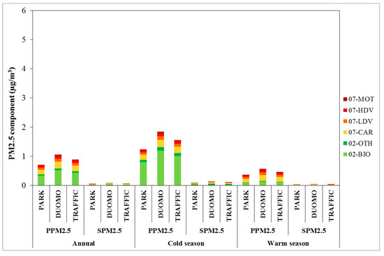 At PARK receptor the overall contribution of the local sources displays a clear seasonal pattern (Figure 3a), with higher contribution in the cold season (>1 µg/m3 from December to March) and lower contributions in the warm season (<0.5 µg/m3 from April to October). Peaks up to about 1.5 µg/m3 are estimated in February and December and the lowest concentrations (about 0.25 µg/m3) from June to August. The pattern is mainly driven by the seasonality that affects sources’ activity, with emissions from C&R combustion in addition to traffic emissions in the cold season. C&R combustion, namely biomass burning (02-BIO), is the first contributor among local sources with a contribution ranging between 0.5 µg/m3 and 0.9 µg/m3; conversely, it is almost negligible in the warm season when its contribution is about 0.04 µg/m3. Road traffic contribution is rather constant throughout the year (ranging between 0.25 µg/m3 and 0.5 µg/m3). In the cold season (January–March), 58.2% of PM2.5 from local sources comes from C&R combustion (category 02), mostly from biomass burning (52.3%); in the warm season (July–September), its contribution drops down to 16.2%, still almost entirely due to biomass combustion (14.5%). Road traffic is responsible for 41.9% of PM2.5 mass in the cold season and for 83.8% in the warm season. However, notwithstanding the higher values computed during winter for C&R combustion, on annual basis road traffic (57.1%) prevails on domestic heating (42.9%). In details, on annual basis passenger cars contribute for almost half of the road traffic share (27.8%), light- and heavy-duty vehicles produce almost the same contribution (13% each), while mopeds and motorcycles account for about 4%.