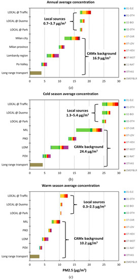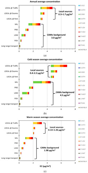 The comparison between seasonal results (Figure 9b,c) highlights the wintertime contribution of biomass burning: at PARK and DUOMO biomass combustion (~2.5 µg/m3, 48%) slightly prevails on road traffic provide almost the same contribution (2.2 µg/m3, 43%); at TRAFFIC, the latter source prevails (3.8 µg/m3 vs. 2.6 µg/m3, that is 56% vs. 38% of total EC). Conversely, in summertime biomass combustion displays a much lower contribution (0.25 µg/m3), almost entirely deriving from sources outside the LOCAL region, and at all receptors road traffic is, by far, the first contributor overall (1.5–2.6 µg/m3, that is 70–80% of EC). As far as traffic contribution is concerned, on both in the cold and warm season the LOCAL region contribution prevails on the MIL region one at the TRAFFIC receptor (1.9 µg/m3 vs. 1.2 µg/m3 and 1.2 µg/m3 vs. 0.9 µg/m3, respectively) contrary to the two other receptors, and especially at PARK, where LOCAL region (0.26 µg/m3 and 0.12 µg/m3) is by far exceeded by the MIL region contribution.
