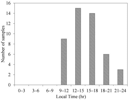 Only 47 samples (30 min each) were involved in the analysis out of the 20-day continuous measurements. The histogram in Figure 2 illustrates the distribution of the considered samples over the day hours. The thermal stability range of the selected samples was within , which can be treated as near-neutral conditions. A 2-Hz low-pass spectrum filter was applied to exclude the noise. The mesoscale motions (large-scale thermally-generated TCS) were filtered out via a high-pass spectrum filter, in which the cut-off frequency was calculated by wavelet analysis, as to be discussed in Section 2.2.