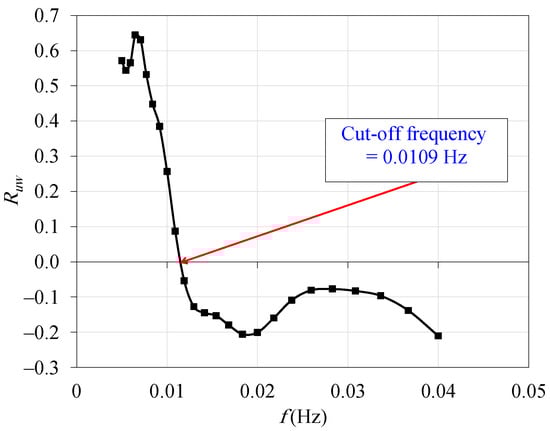 The wavelet analysis was applied to determine the cut-off frequency of the mesoscale motions. Various techniques were applied to remove these scales without harming the low-frequency turbulent motions [34,40]. In this research, a method based on wavelet decomposition was applied. The low frequencies (<0.04 Hz) were decomposed into 25 wavelets. The signals were cross-correlated with the signals. An example of the variation of the cross-correlation factor with wavelet frequency is illustrated in Figure 5. A fundamental property of TCS is the negative cross-correlation between and [30]. Thus, the cut-off frequency was defined as the border between positive and negative correlations.