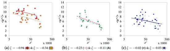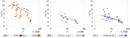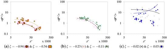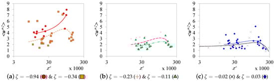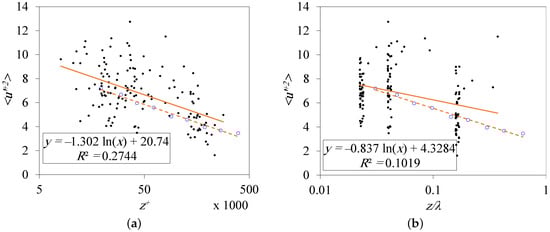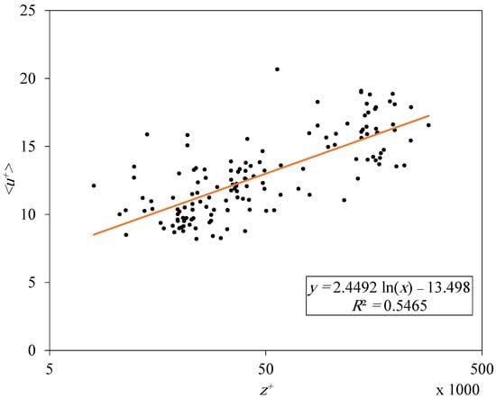 Similarly, an average fitting for the near-neutral atmospheric mean velocity data was plotted in Figure 8. These operations yield a slope of ∼2.5, which corresponds to , but the intercept is larger compared with the commonly acceptable value (5.0) due to the surface roughness effect [51]. A much definite trend can be found in logarithmic relations, as shown in Figure 9. The slope of the relation increases as the atmosphere becomes more convective and reaches a high value of 1.92 in the subset. The slope is at the minimum at with a value of 1.038. The average slope is for the inner-scaled data (Figure 10a) and for the -scaled data (Figure 10b). The deviation from the results obtained by Hutchins et al. [40] is obvious.