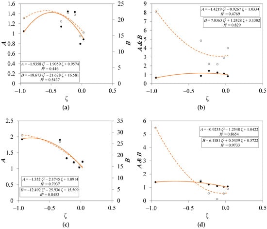 Stability effect on slope (A) and intercept (B) of the logarithmic relations of the windward (a,b) and crosswind (c,d) turbulent velocity fluctuations: (a,c) inner-scaled, (b,d) outer-scaled. • indicates the slope, ⚬ indicates the intercept, and the lines are second-order polynomial fittings.