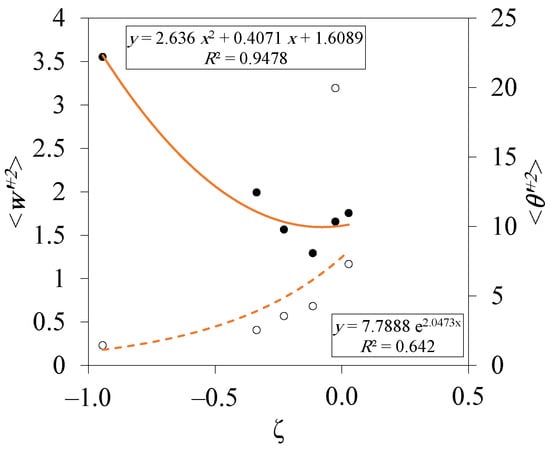 The temperature variance follows an exponential trend (Figure 12), specially at high convective conditions (). As a matter of fact, temperature fluctuations weaken away from the ground under convective conditions and strengthen under stable conditions with the neutral state witnessing null variation with height. The turbulent temperature variance tends at ground-level to a value ranging between 1.44 and 20, according to . Despite that the power regression is more common in the literature [24,28], the second-order polynomial regression for and the exponential regression for were found to best-fit the current data. Recall that this is the first time using as a height scale instead of the typical and .
