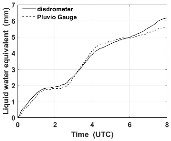 Comparison of liquid water equivalent snow accumulations computed using the density determination based on Parsivel2 disdrometer measurements (Equation (2)) and that were directly measured by Pluvio2 gauge for 19 March 2018 at YPO site.