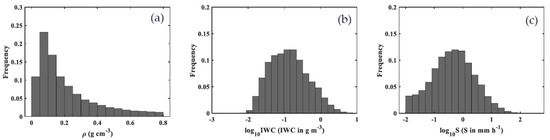 Histograms of snow PSD parameters for total snowfall events: (a) the density of snow, (g cm−3); (b) ice water content, ( in g m−3); (c) liquid water equivalent snowfall rates, ( in mm h−1).