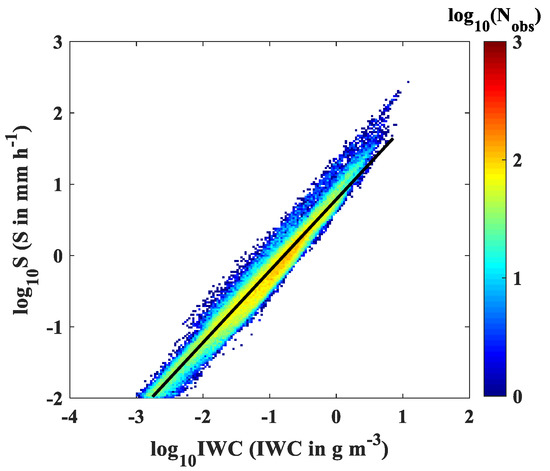 - For all snowfall events, more than half of the snow PSD measurements are characterized by density less than 0.2 g cm−3. The standard deviations of density, ice water content (IWC), and snowfall rate (S) are large which indicates a high variability of particles during the snowfall events. The relationship between snowfall rate and ice water content can be expressed as a power-law function, consistent with the previous study [33]. It implies that if the IWC is known, such as from aircraft measurements, the S can be derived. The pressure level and the way to calculate density can make the relationship different. Additionally, the relationship proposed in this study is suitable for ground observations.