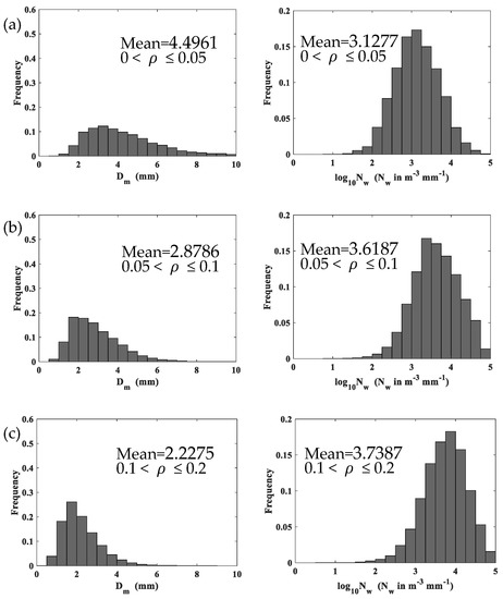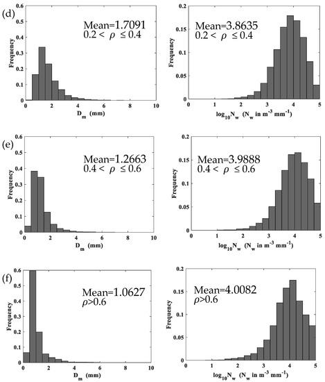 Unlike the density of raindrops, the density of snow is not well defined and depends on various factors such as snowfall types and topography. The complexity of the structure of snow particles makes snowfall estimation more complex than rainfall estimation. There is few size–density relationships mentioned in the previous studies which describe the density of snow [30,31,32]. However, these relationships cannot describe the density of snow events captured in the PyeongChang region, because snow particles vary greatly in different topography and events [26,27,28,30,31,32,33,34,35]. In this study, we use aerodynamic relationships to determine the density of snow, then study the characteristics of snow PSD at different density and liquid water equivalent snowfall rates (S) classes. One of our goals in this study is to use a large dataset of snow PSD measurements collected during a period over three years to explore the relationship between the density of snow () and the volume-weighted mean diameter (), which is suitable for the PyeongChang region in South Korea.