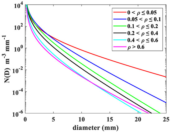 To further understand the characteristics of snow PSD at different snow densities, we classified the snow density into six classes as follows: 0 < ≤ 0.05 g cm−3, 0.05 < ≤ 0.1 g cm−3, 0.1 < ≤ 0.2 g cm−3, 0.2 <≤ 0.4 g cm−3, 0.4 <≤ 0.6 g cm−3, and > 0.6 g cm−3. Figure 6 shows the distribution of and for different density classes and the mean values are also indicated. It can be seen that the distribution depends on density and low-density particles are generally larger, this is likely because the particles become more condensed as density increases, thus giving a smaller , which is in agreement with previous studies [26,27,28,30,31,32]. This dependence of on density is not surprising, and it is discussed in more detail below. Distributions of also exhibit dependence of on density because and density are related, dependence of on density arises from the dependence on on , which is the same as previous study [26]. As shown in Figure 6, increases with density. The mean values of , , and for different density classes are listed in Table 3. From Figure 6 and Table 3, low density events have a broader range of snow PSDs, while high density events demonstrate larger snow particle concentrations. It is clear that decreases with the increasing density, and and increase with the increasing density, and these results are consistent with prior studies [26,27,28]. To study the snow PSD shapes of the total categorized data set, Figure 7 shows mean snow PSDs for different density classes. As the density becomes lower, all particle sizes are more frequent which in turn decreases the slope parameter of snow PSDs, which is consistent with previous study [28]. Additionally, the widths of the snow PSDs become broader and show a long tail towards larger diameters. This is because of the composite of a wide range of snow PSDs.