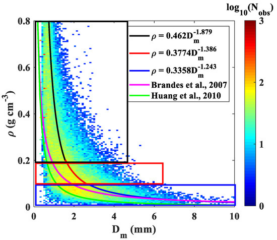 Scatter density plot for (g cm−3) versus (mm) and mean - power-law fitting for different ranges. Black fitting is for > 0.2, red fitting is for 0.1 << 0.2, and blue fitting curve is for 0 < < 0.1.