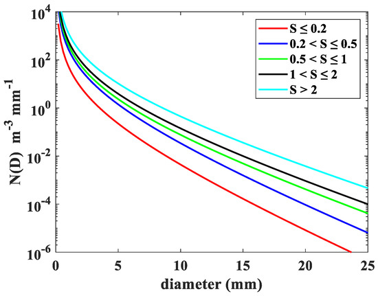 To have a better understanding of the characteristics of snow PSD at different snowfall rate classes, the snow PSD measurements were divided into five classes: S ≤ 0.2 mm h−1, 0.2 < S ≤ 0.5 mm h−1, 0.5 < S ≤ 1.0 mm h−1, 1.0 < S ≤ 2.0 mm h−1, and S > 2 mm h−1. Mean values of , , and for different snow rate classes are listed in Table 4. It is clear that the mean values of , increase and decreases with the increasing snowfall rate. Figure 9 shows the mean snow PSDs for five snowfall rate classes. The slope of the snow PSDs decreases, and all particle sizes are more frequent with increase of snowfall rate. Furthermore, snow PSDs become broader and the tail of snow PSD shifts gradually to the larger diameter with the increase of snowfall rate, which is in agreement with previous studies [27,34,35].