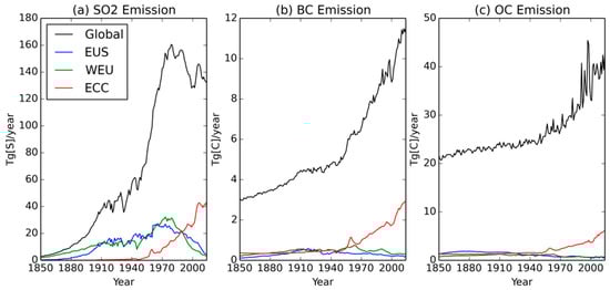 To estimate the time evolution of ERF () over the historical period (1850–2014), the transient simulations newly introduced in CMIP6 were analyzed. These simulations have been designed with prescribed historical SSTs and sea ice fields to calculate the ERFs due to aerosol forcing: the histSST (with all forcings as historical) and the histSST-piAer (with all forcings as historical but using aerosol precursor emissions of the year 1850). The monthly mean time-evolving SSTs and sea ice from the historical simulations have been prescribed. The simulations covered a historical period of 165 years (1850–2014) and the emission of major aerosol precursor gases (SO2) and primary aerosols (BC, OC) over this period are shown in Figure 1. The radiative effects of the aerosol emissions were estimated by subtracting the histSST-piAer simulations from the histSST simulations.