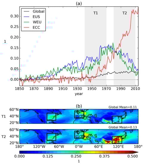 In this study, the T1 period (1940–1970), when all the major regions emitting anthropogenic aerosols have an increasing AOD, and the T2 period (1980–2010), when AOD decreases in EUS and WEU and continuously increases in ECC, are analyzed separately. Figure 2b shows the spatial distribution of AOD in the T1 and T2 periods. Despite the reversed changing trend between T1 and T2 periods, a similar AOD on average is shown in EUS and WEU. The largest AOD in the world is shown in ECC over the T2 period as the aerosols increase dramatically.