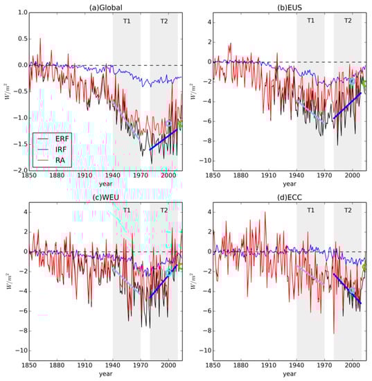 The transient responses of global and regional ERFs due to aerosol forcing over the historical period have been analyzed (Figure 3). The ERF is further decomposed into IRF and RA which are estimated by Equation (1). The IRF includes aerosol-radiation interactions (i.e., scattering and absorption) and the RA is driven mainly by aerosol-cloud interactions. As the AOD increases in all the domains (Figure 2a), regional aerosol ERF shows a decreasing trend, exerting a global ERF of approximately −1.03 in the T1 period. The regional effect of aerosol changes in this period is much greater than the global effect. The decreasing trend of aerosol ERFs have been shown in all the regions. Particularly, WEU (−0.10 ) show a stronger aerosol ERF trend than EUS (−0.08 ) and ECC (−0.07 ). In the T2 period, the negative aerosol ERFs have been rapidly recovered in EUS and WEU as regional AOD decreased. Since they still have a negative ERF compared to the PI period, the radiative cooling effect of aerosols has been prominent even in the recovery state. In contrast, the decreasing trend of aerosol ERF in ECC (−0.10 ) becomes stronger as the AOD continuously increases. As these regional responses cancel each other out, global-mean aerosol ERF (0.01 ) seems to be relatively constant in the late 20th century.