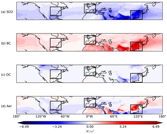 Geographical distribution of the present-day (PD) (2014) instantaneous radiative forcing (IRF) relative to the pre-industrial period (PI) (1850) for (a) SO2, (b) BC, (c) OC, and (d) all aerosols in .