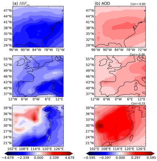 The spatial distributions of the shortwave component in the IRF () and AOD change are shown in Figure 5. In EUS and WEU, the increase in AOD seems to be highly correlated with the reduction in . This significant negative correlation indicates that the main contributor of is the reduction in radiation due to the increased scattering of aerosols which reflect incoming shortwave radiation. On the other hand, a lower spatial correlation is shown in ECC where the effect of absorbing aerosols is larger than other regions. The negative correlation between AOD and as in other regions is shown in ocean areas, while the opposite pattern is shown inland due to the dominant effect of absorbing aerosols.