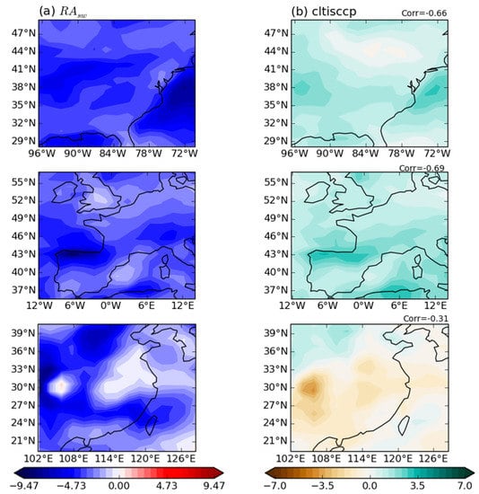 As shown in Figure 3, the RA—mainly composed of shortwave components ()—contributes largely to the aerosol ERFs. The decomposition of the RA into a component due to any non-aerosol change in clear-sky flux () and cloud property changes () shows that the aerosol-cloud interactions are the major constituent process to the RA (Table 2). Therefore, the change in total clouds according to ISCCP (International Satellite Cloud Climatology Project) classification has been analyzed here as one of the main contributors to (Figure 6). In EUS and WEU, the negative seems to be highly correlated with the increase in total clouds. Consistent with the previous studies showing that the radiative cooling due to the aerosol-cloud interactions is the main factor to determine the aerosol ERFs [40,41], the negative seems to be closely related with the increase in clouds, and especially stratus clouds ( < 680 hPa and τ > 23, Figure 7). The increase in stratus clouds can be explained by the stabilization of the atmosphere due to surface cooling by aerosols [46].