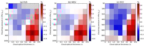 Regional (1st: EUS, 2nd: WEU, and 3rd: ECC) mean change in ISCCP-simulated cloud fraction in CTP (Cloud Top Pressure) -τ space for the T2 period (1980–2010) relative to the pre-industrial period (1850). The 90% significance denoted as dashed lines.